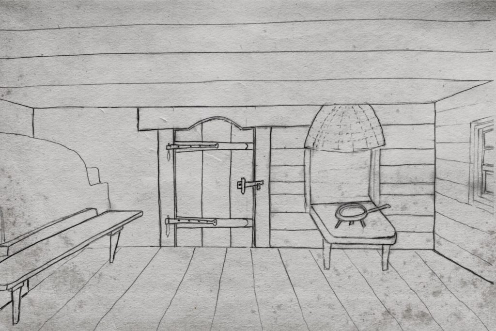 Den ehemaligen „Rauchhut“ kann man an den Löchern in der Wand erkennen. Hier wurden halbkreisförmig gebogene Zweige befestigt, die man mit Lehm beworfen hat. So entstand ein Kamin. Auch die Rückwand war mit Lehm ausgekleidet.